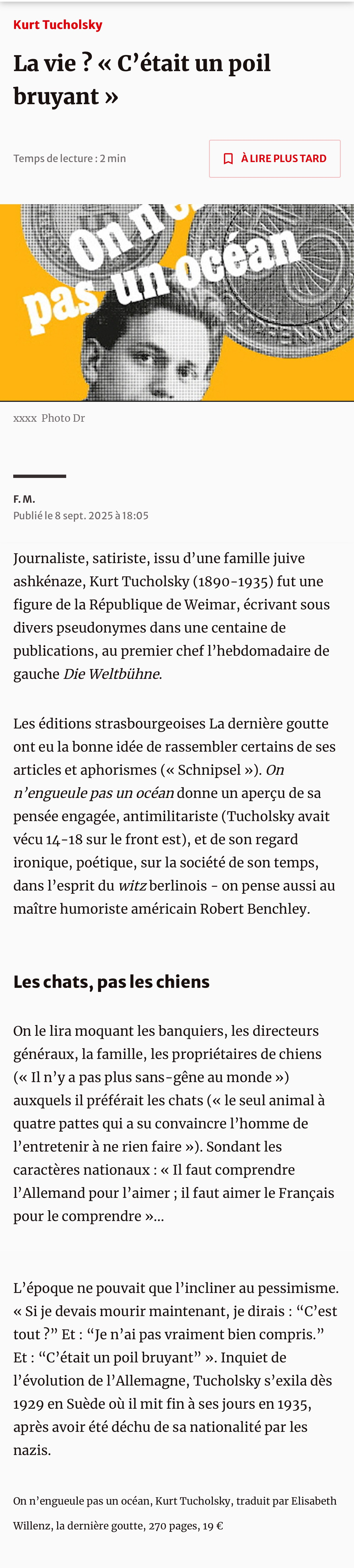 Une chose est sûre avec Kurt Tucholsky : il n’aime pas l’eau tiède. Son humour est féroce, son ironie piquante et sa lucidité implacable, comme le montrent de manière éclatante ces textes tour à tour drôles, mordants, mélancoliques, et toujours profonds, écrits entre 1913 et 1932. Désespérément engagé, il ne peut que constater, impuissant, que les hommes ne cessent de faire les mauvais choix, ce qui inspira à Erich Kästner cette belle formule pour le décrire : « Un petit Berlinois grassouillet qui, muni d’une machine à écrire, voulait arrêter une catastrophe. »